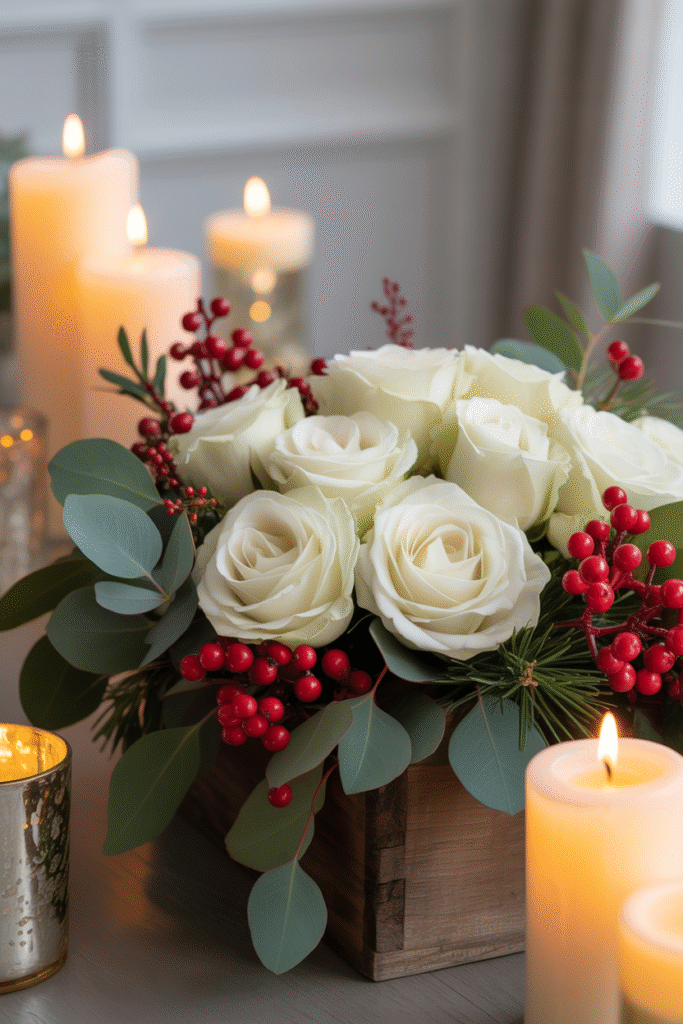 Christmas doesn’t have to mean only red and green. Try a floral arrangement with white roses, eucalyptus, and red berries. Keep it low so no one has to crane their neck around the flowers just to gossip with Aunt Linda.