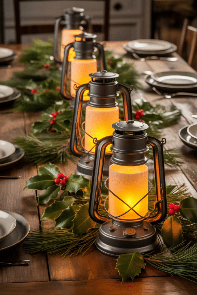 If you own lanterns, line them down the center of the table with LED candles inside. Add sprigs of pine or holly around the base. The vibe screams rustic lodge, and honestly, it looks like something straight off a Pinterest board.