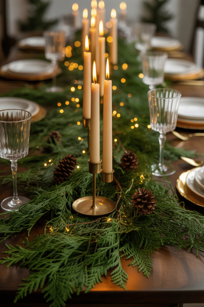 I’ll start with my personal go-to: a long garland of evergreen branches running down the table, dotted with tall taper candles and a few pinecones. Simple? Yes. Gorgeous? Absolutely. Ever wondered why this works so well? Because green + gold + flickering light is the holy trinity of holiday decor.