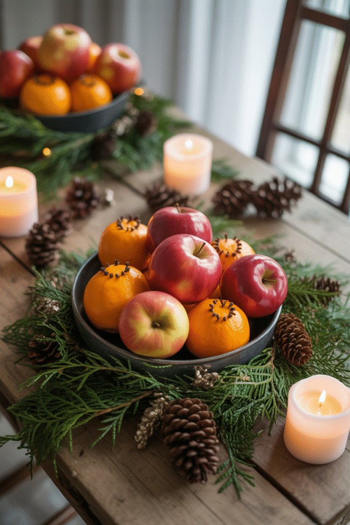 Want something edible and chic? Try bowls of pomegranates, oranges with cloves, or red apples, mixed with pine sprigs. Not only does it look festive, but it smells amazing too. Plus, you can snack on your decor later—zero waste FTW. 🙂
