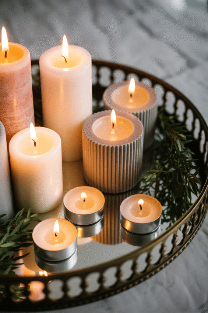 Buy candles in different heights and group them together on a mirrored tray. Add sprigs of greenery around the edges. The reflections double the glow, and you’ll feel like you’re eating dinner in a Hallmark movie.