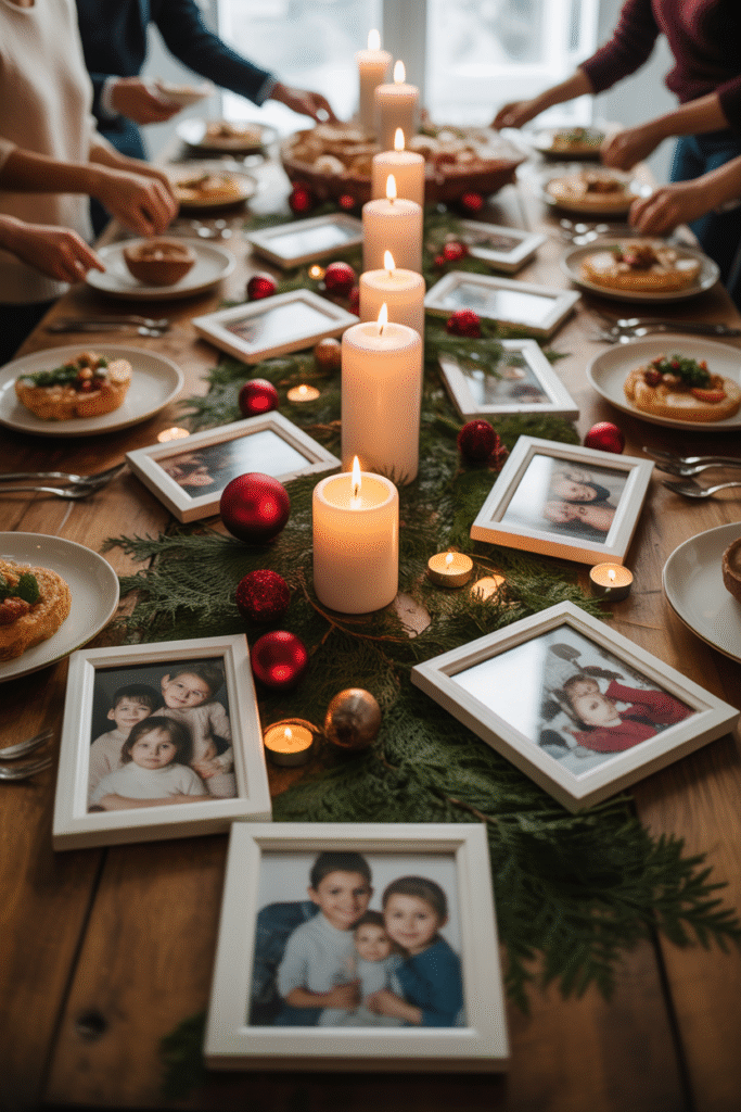 This is where you get sentimental. Frame family Christmas photos, mix them with candles and greenery, and place them down the center. Guests always pause to smile and reminisce. Honestly, this centerpiece gets the most compliments every year.