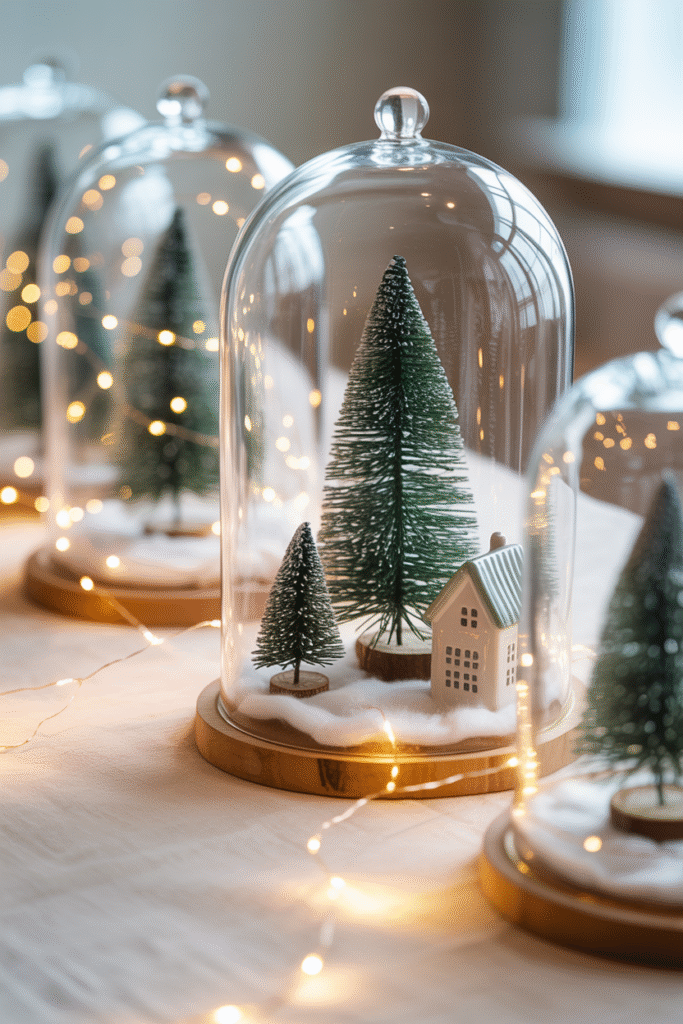 Take a glass cloche (or even a big glass jar), fill it with bottle brush trees, faux snow, and maybe a tiny reindeer figurine. Place two or three of these along the table. They’re basically mini snow globes that people can’t stop staring at.