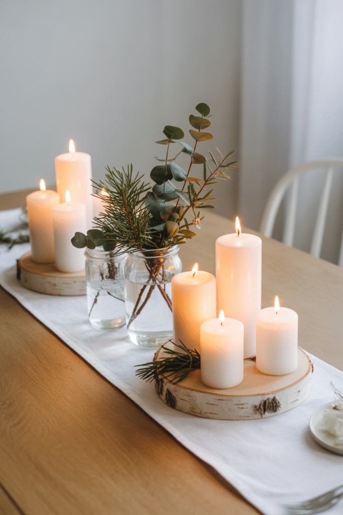 Think white candles, pale wood accents, and greenery tucked in mason jars. It’s calm, cozy, and very “hygge.” Ever sat at a table that feels like a warm hug? That’s this centerpiece.
