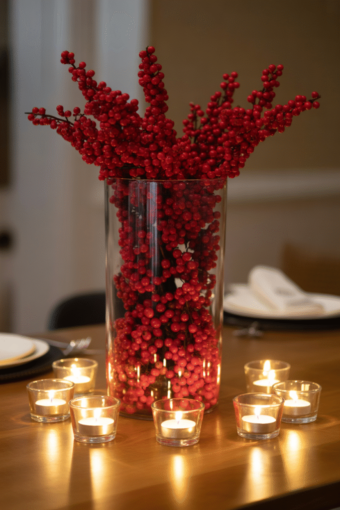 A tall vase filled with bright red winterberries makes a bold, modern statement. Surround it with small tea lights for extra drama. This one’s a crowd-pleaser because it looks fancy but takes about five minutes to pull together.