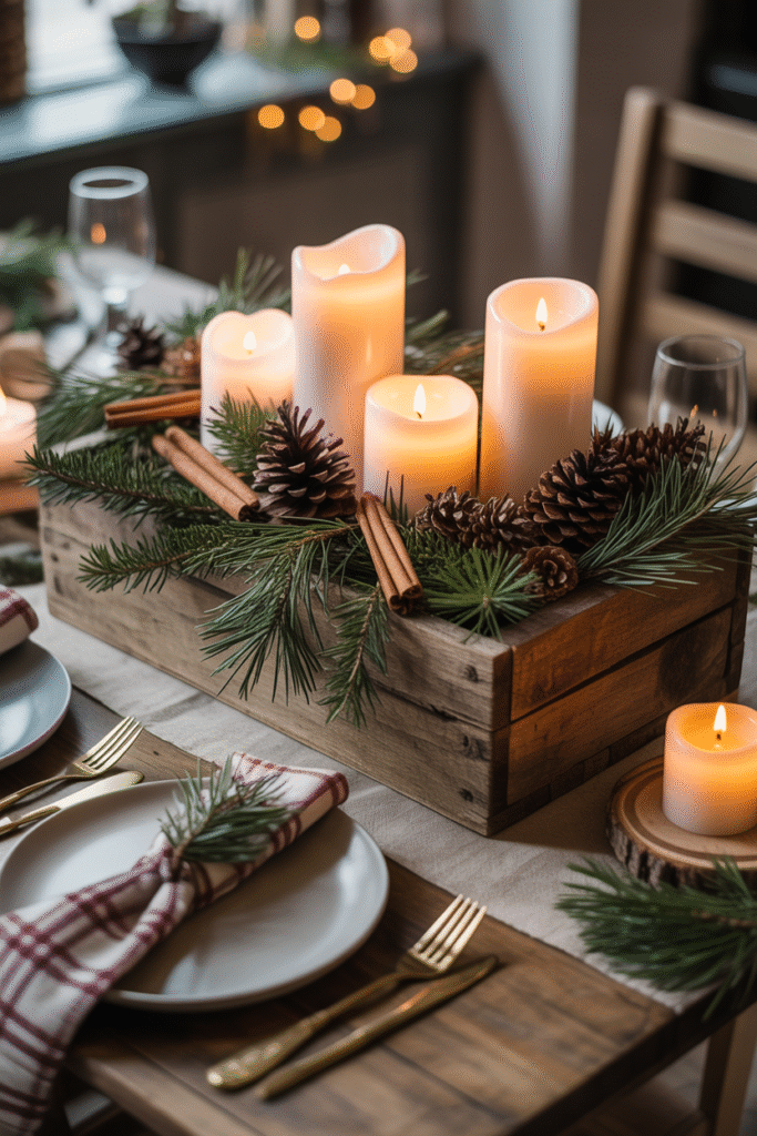 Line a rustic wooden box with greenery, pinecones, cinnamon sticks, and a few LED candles. The scent is insane, and the look is basically “I decorated with the forest, and it turned out fabulous.”
