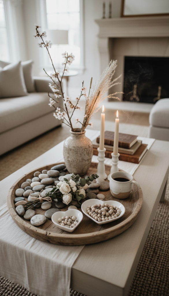 Bring in texture with wood accents, stone coasters, or natural ceramics. These earthy elements complement romantic motifs without feeling overly themed. A small bowl of polished river stones or a wooden heart keeps it grounded yet thoughtful.
