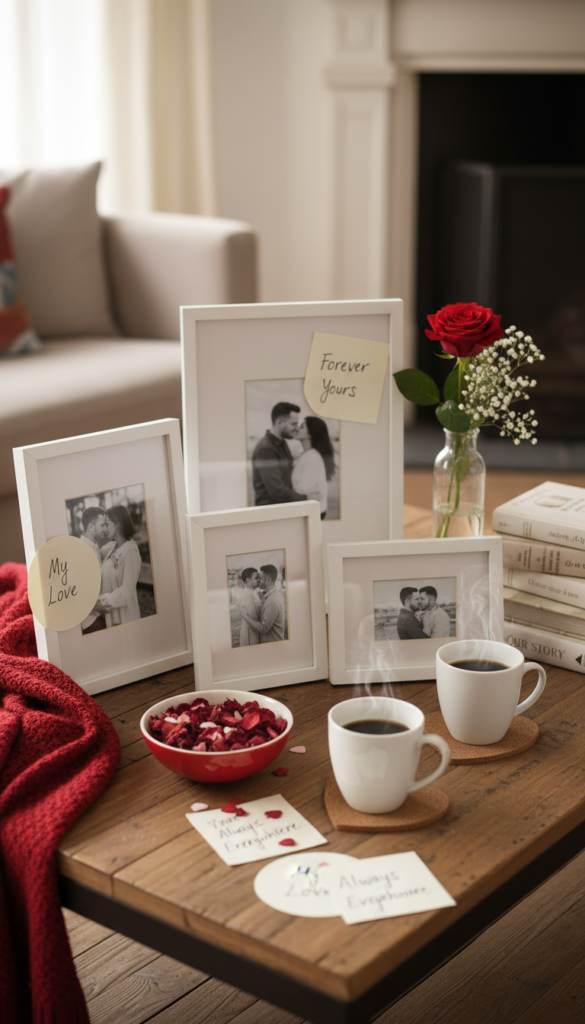 Incorporate framed photos from meaningful moments or hand-written love notes tucked into a pretty envelope. These personal touches make your décor uniquely intimate and avoid generic Valentine’s clichés.