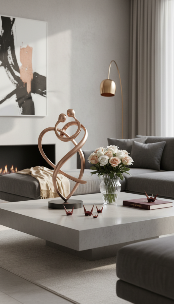 Finish with a single sculptural piece — perhaps an abstract heart or elegant figure — that serves as a focal point. It adds visual interest and sophistication to your coffee table composition.