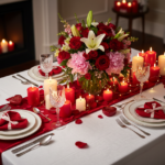 A romantic floral arrangement instantly sets the mood. Opt for a mix of roses, peonies, or ranunculus in gentle blush, cream, or deep wine tones. Arrange them in a low vase or vintage pitcher to keep the line of sight unobstructed and invite conversation.