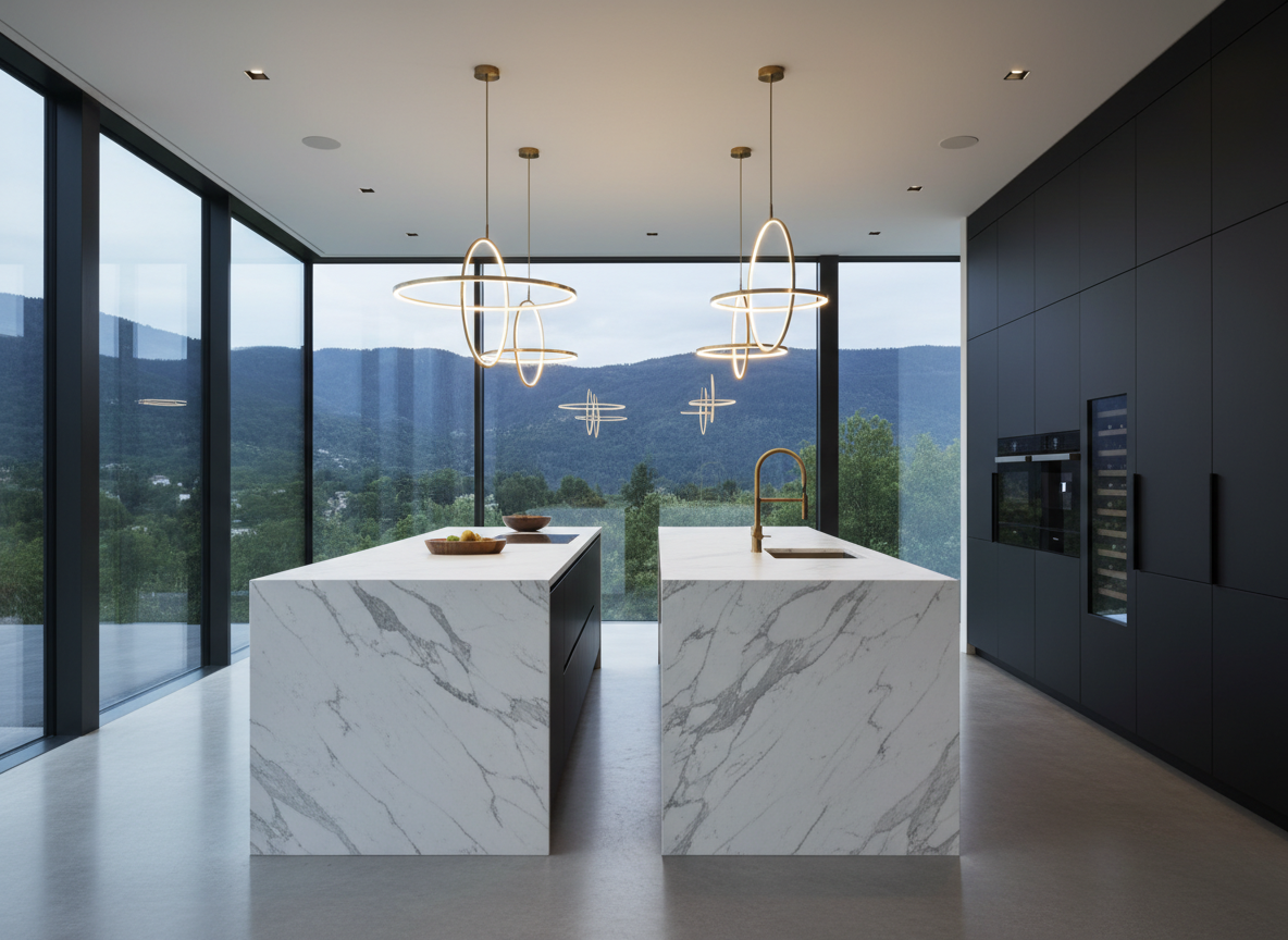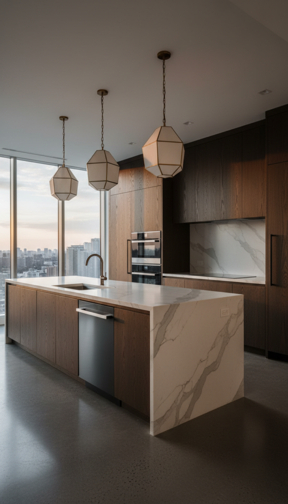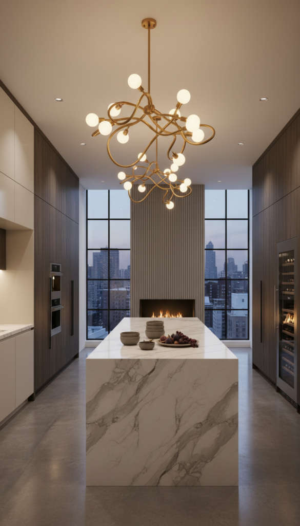 Lighting is the jewelry that finishes the outfit. Instead of standard pendants, opt for oversized, sculptural chandeliers that act as art pieces above the island.