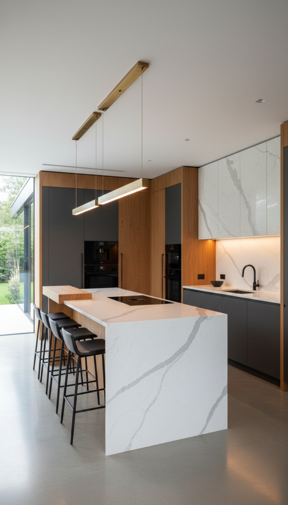 Nothing says grandeur quite like a massive central island. To truly capture island kitchen ideas modern luxury style, opt for a double waterfall edge where the stone cascades down both sides to the floor.