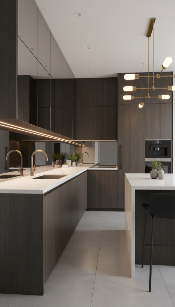 Limited square footage doesn’t mean limited style. Small kitchen ideas modern luxury focus on vertical storage, mirrored backsplashes, and premium compact appliances.