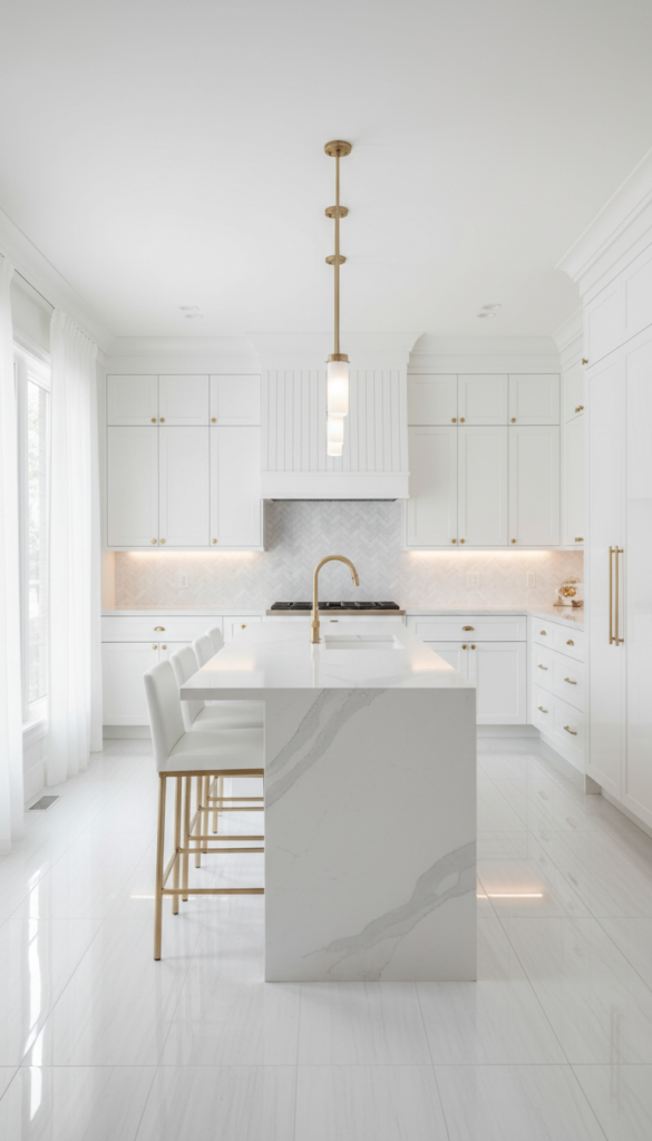 There is a reason kitchen ideas modern luxury white search volumes remain high—it is timelessly chic. An all-white palette reflects light, making the room feel expansive and incredibly clean.