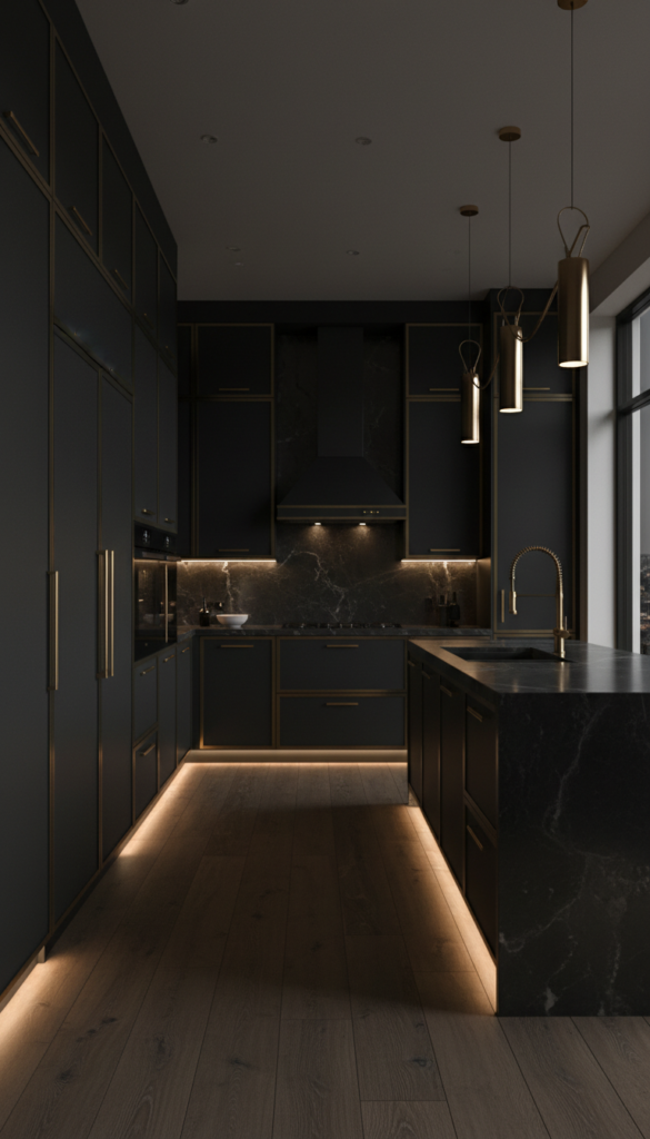 Why it works: Black recedes visually, allowing metallic accents and stone backsplashes to pop. It creates a cozy, intimate vibe that is perfect for evening entertaining.