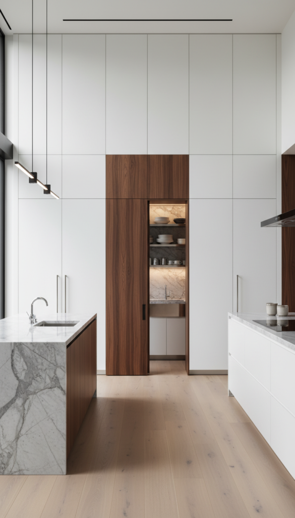 True luxury is about suppressing the mess. A hidden “butler’s pantry” or scullery allows you to keep the main kitchen pristine while the real work happens behind closed doors.