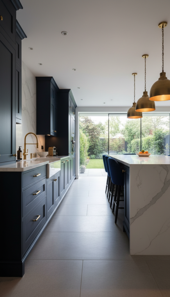 Don’t forget the “fifth wall.” Kitchen ceiling ideas modern luxury designs often incorporate coffered details, warm wood beams, or recessed tray ceilings with hidden glow lighting.