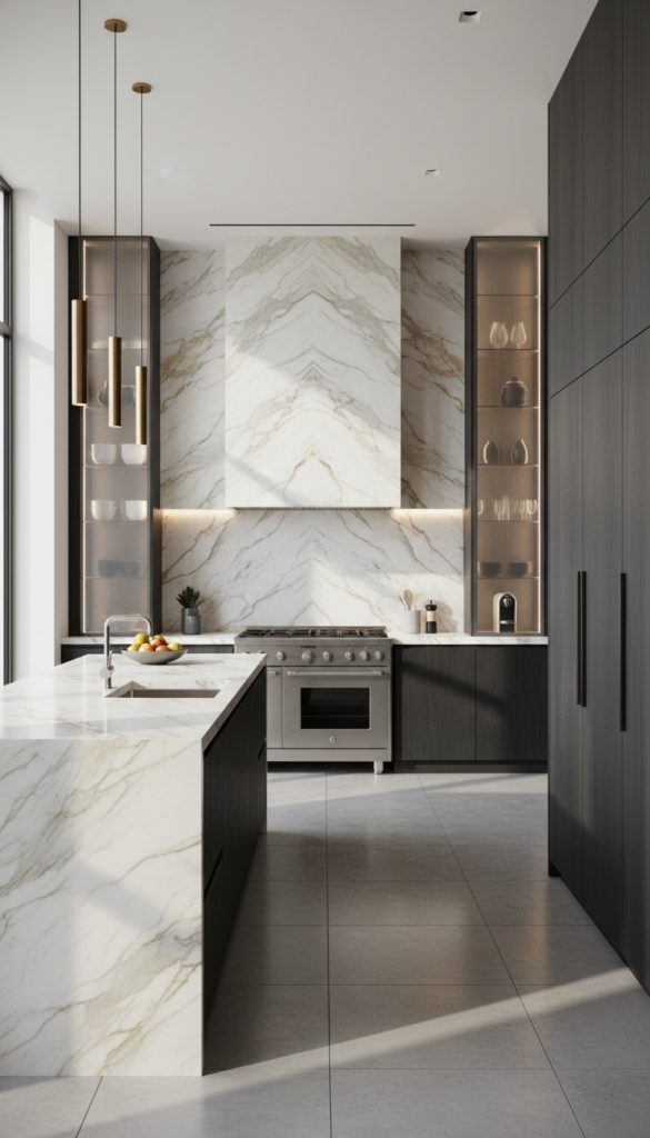 Forget the standard 4-inch backsplash. High-end kitchens extend the stone slab from the countertop all the way to the ceiling.