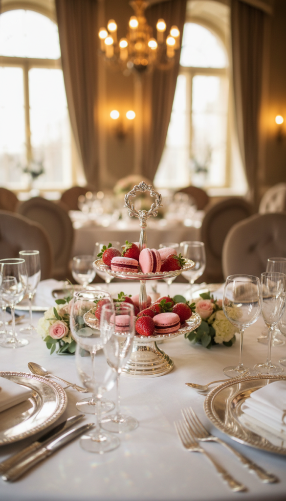 Why buy flowers that die when you can build a tower of treats? Strawberry towers or macaron pyramids serve as stunning focal points that guests can actually eat. This efficiency-boosting hack saves space and budget.
