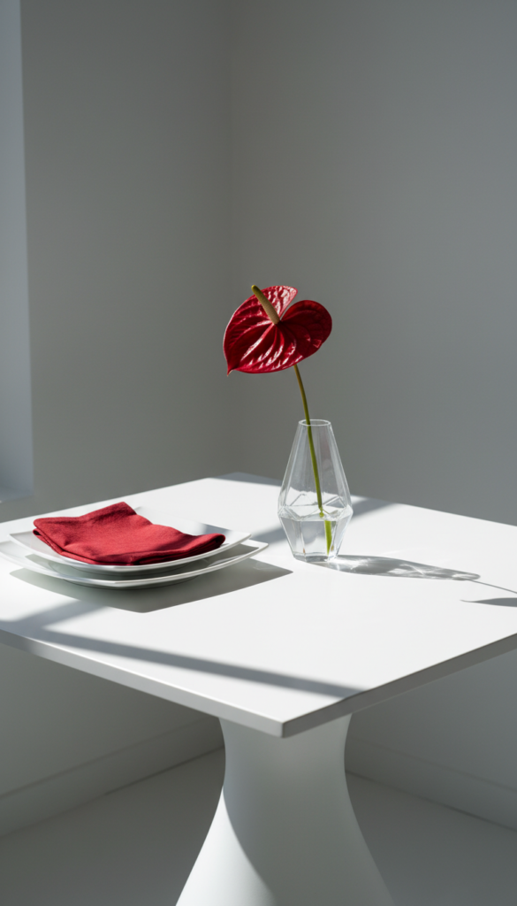 One bold color can make a massive statement. Monochromatic red—but make it modern with clean lines and zero clutter. Use a crisp white table and place a single, architectural red anthurium stem in a glass vase.