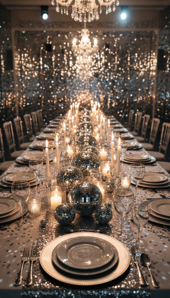 Reflect the love. Mini disco balls scattered among votive candles create thousands of dancing light specks across the room. It’s the perfect vibe for a lively Valentines Day decorations party theme.