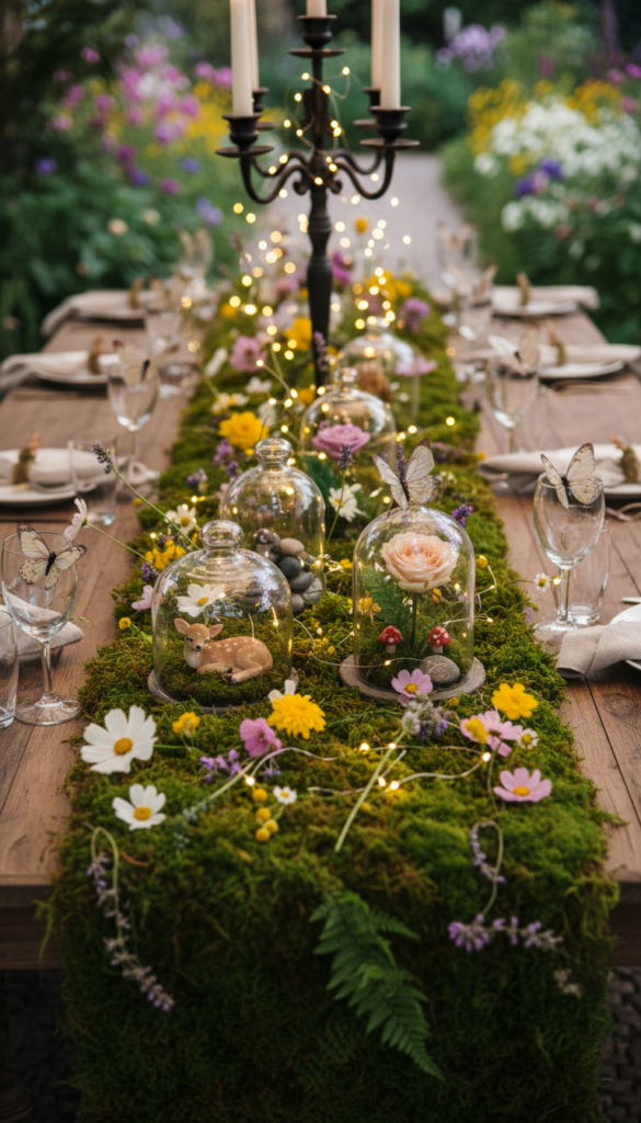 Bring the outdoors in. A moss runner acts as a verdant base for wildflowers and butterfly accents. It feels like a fairytale picnic sprung to life in your dining room.