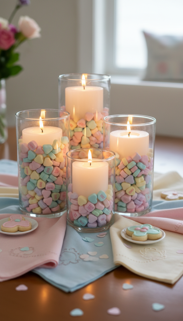 Lean into the nostalgia. Conversation hearts aren’t just for eating; fill clear glass hurricanes with them and nestle a pillar candle on top. The pastel colors provide an instant palette guide.