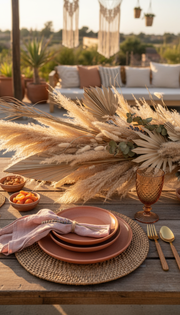 Warm terracotta, dried palms, and dusty pinks create a relaxed, earthy atmosphere. Texture is king here—think linen napkins, woven placemats, and ceramic vases.