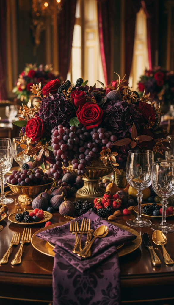 Rich jewel tones scream luxury. Combine gold flatware with deep purple and blackberry-colored accents. Use real grapes and figs as part of the centerpiece styling.