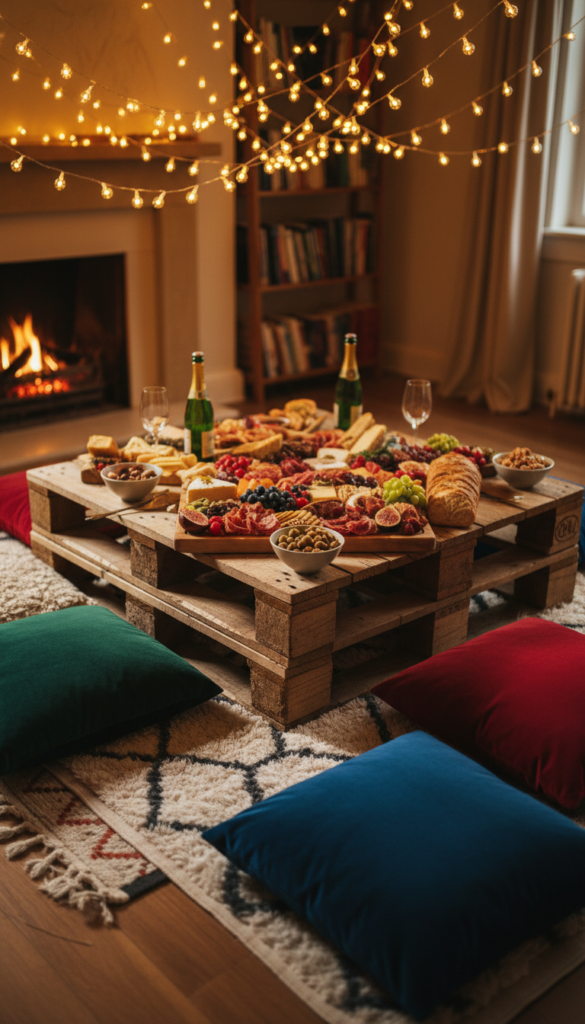 Who needs a dining room? Move the party to the floor with a low pallet table and floor cushions. This is the ultimate intimate Valentine’s Day tablescape for a cozy night in.