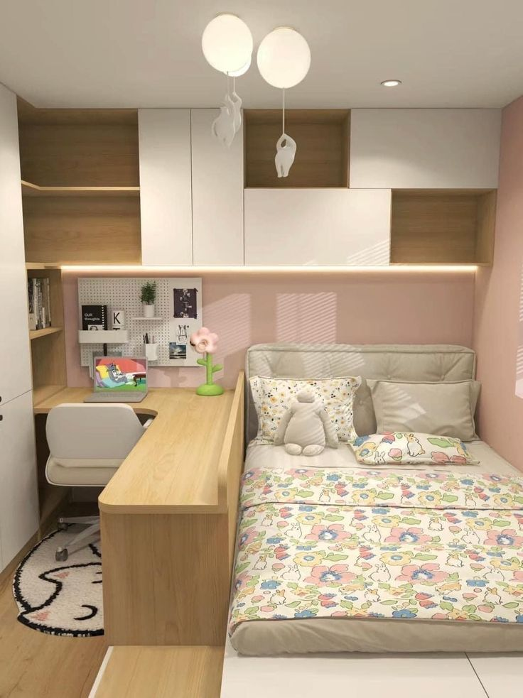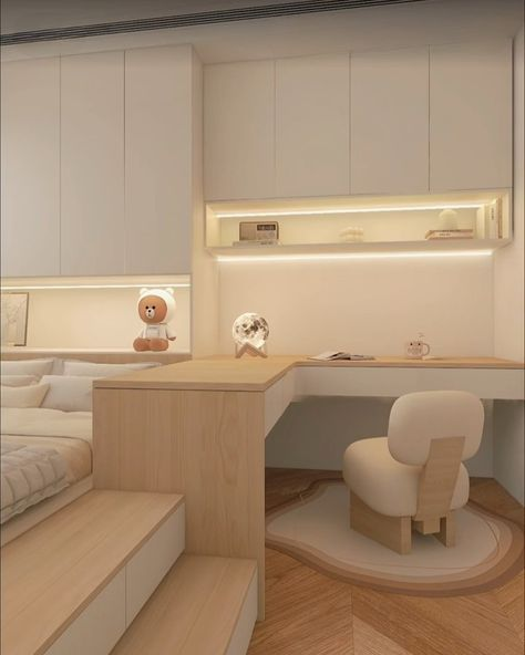 One of the fastest ways to make a room feel calm is to stop relying on loose furniture. Built-in storage keeps everything contained, aligned, and visually quiet. When shelves, cabinets, and desks are integrated into the walls, the room feels intentional instead of pieced together.