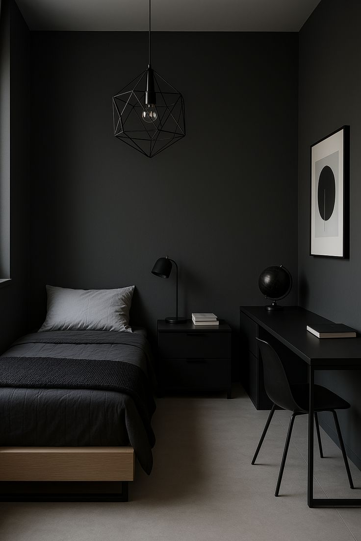 Minimalism doesn’t have to mean light and airy. Deep, dark tones can feel just as calm when they’re used with restraint. A single dark color applied consistently creates a cocoon effect that feels intentional rather than heavy.