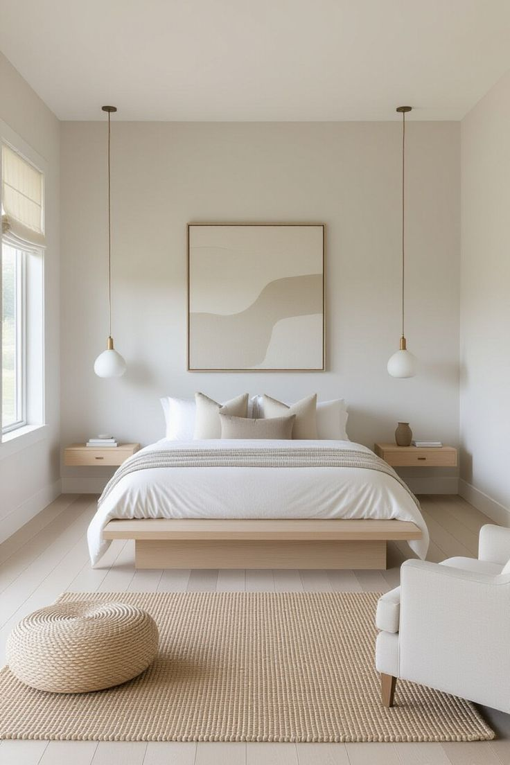 Start by stripping the room back to a tight, neutral color range. Whites, warm off-whites, light greys, and soft wood tones work together to reduce visual noise and make the space feel instantly calmer. When everything sits within the same family of colors, the room feels cohesive even with very few elements.