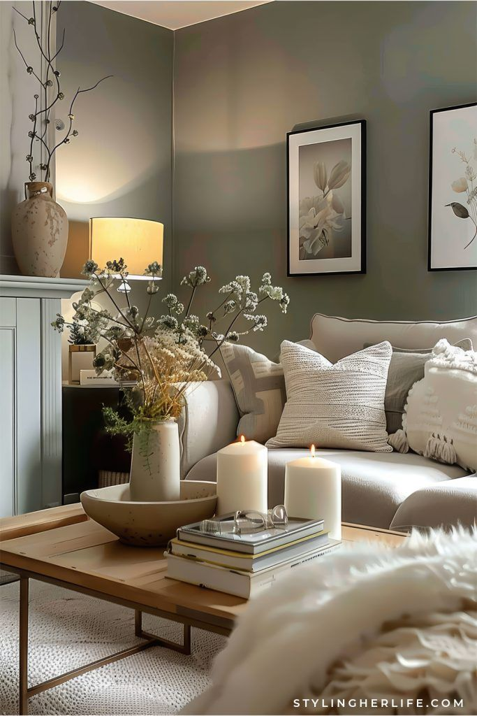 - Pair one muted color (sage, olive, or dusty green) with creamy neutrals