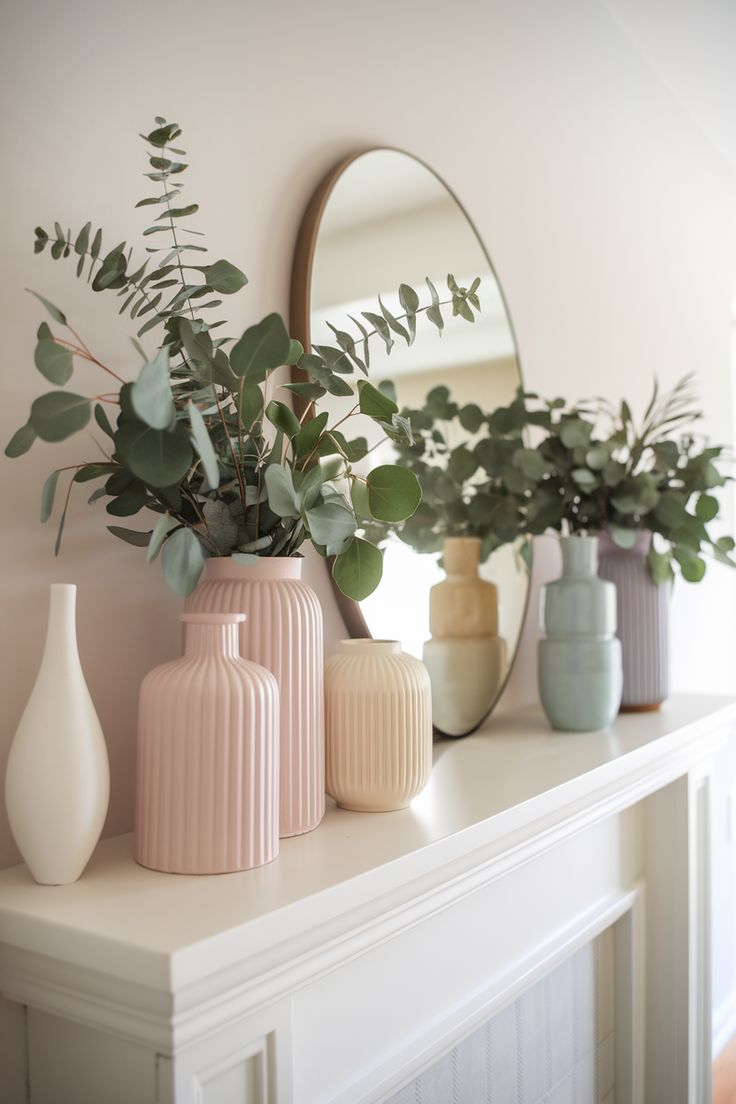 A spring mantel or shelf refresh works best when it feels soft, balanced, and slightly organic. This look captures that perfectly by combining gentle color, natural elements, and a sense of light movement.