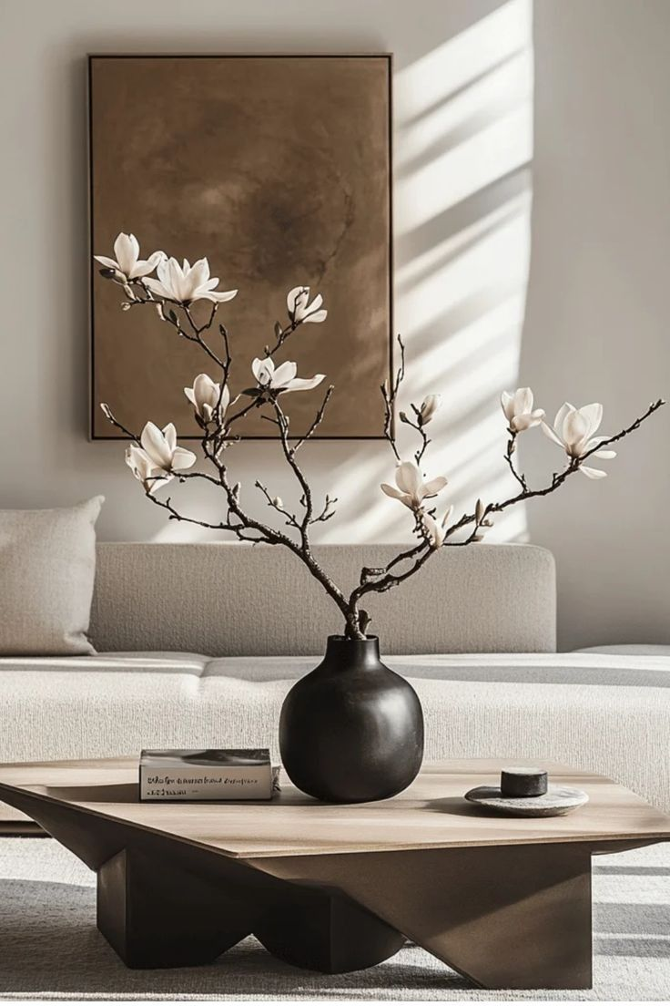A single sculptural vase with flowering branches can completely transform a living room. This look feels modern, calm, and intentional — perfect for spring when simplicity feels refreshing.