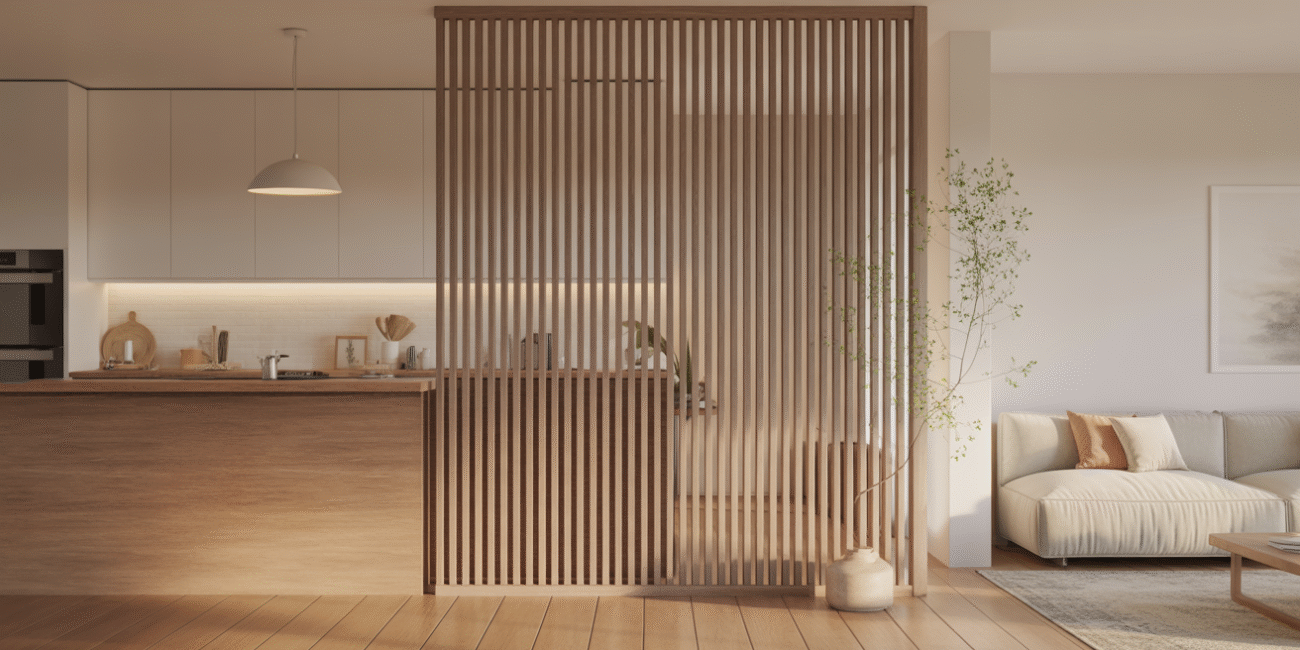 This open shelving divider creates a soft boundary between the kitchen and living room without blocking light or sightlines. The mix of vertical slats and floating shelves gives you display space while still keeping the room airy. It helps organize both zones by offering spots for plants, books, or stylish jars. If you want separation without feeling boxed in, this kind of divider keeps things elegant, practical, and visually calm.