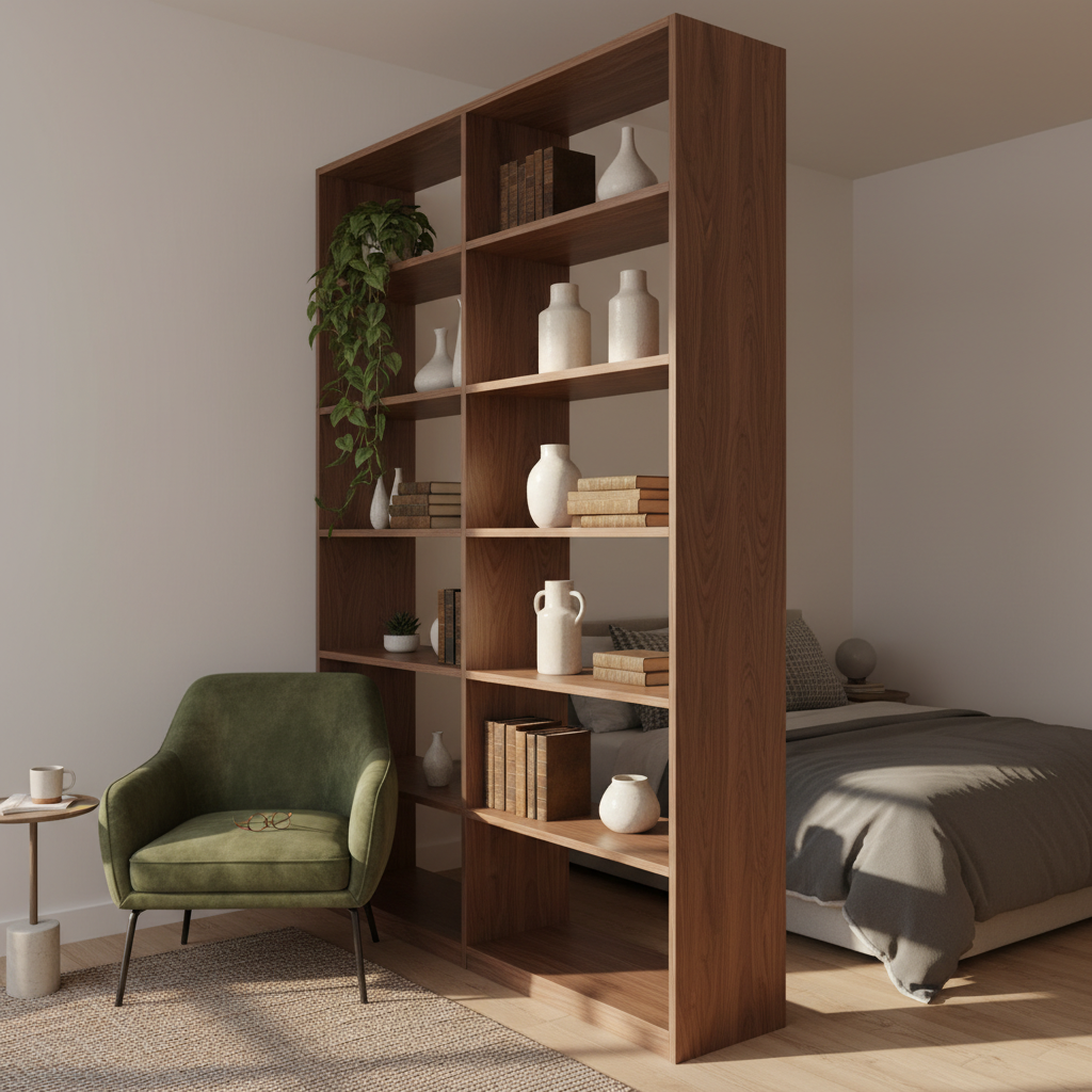 Who says walls have to be solid? Placing a tall, backless shelving unit perpendicular to your main wall creates an instant physical barrier between your sleep sanctuary and your living area. Because the shelves are open, you get distinct zones without sacrificing that precious natural light or making the room feel boxy. It’s the perfect marriage of storage and structure.