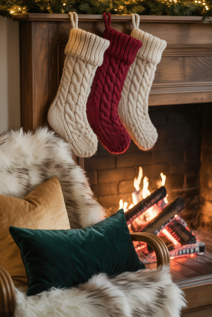 Nothing says “curl up with cocoa” like textures you can almost feel. Hang chunky knit stockings, drape a faux fur blanket nearby, and add a few velvet throw pillows. You’ll create a fireplace nook that practically hugs you back.