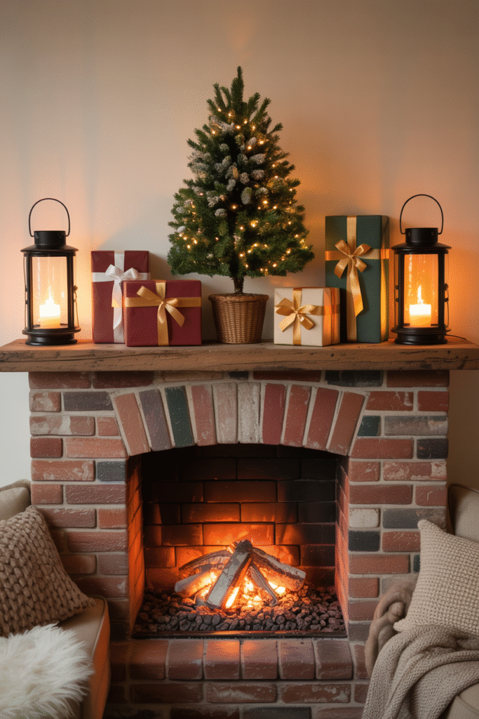 Don’t forget the space below the mantel. Arrange lanterns, wrapped faux presents, or small potted evergreens. Even a cozy basket of firewood adds instant Christmas charm.