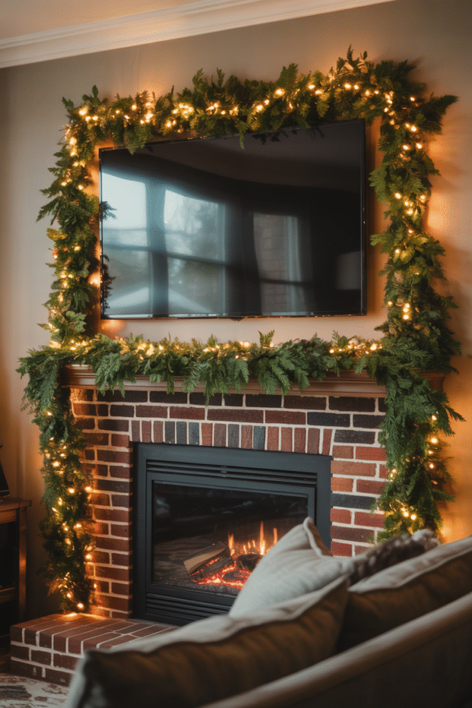 Got a TV above your fireplace? Frame it with a light garland and add subtle twinkle lights. This keeps things festive without distracting from movie night.