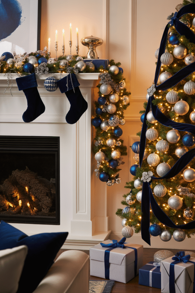 If your tree features silver and navy ornaments, echo those colors in your fireplace decor. Consistency creates a pulled-together, “interior-designer” effect that feels intentional and serene.