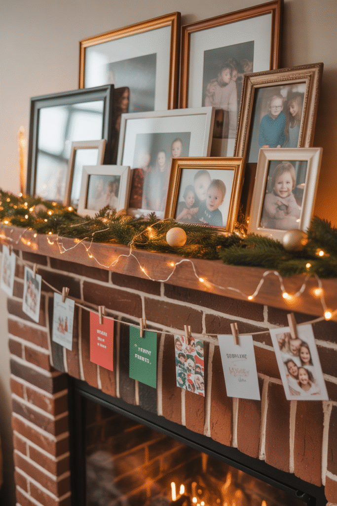 Give your fireplace a personal touch by displaying framed family photos or stringing up holiday cards. Mix in fairy lights or mini clips for a Pinterest-worthy, sentimental look.