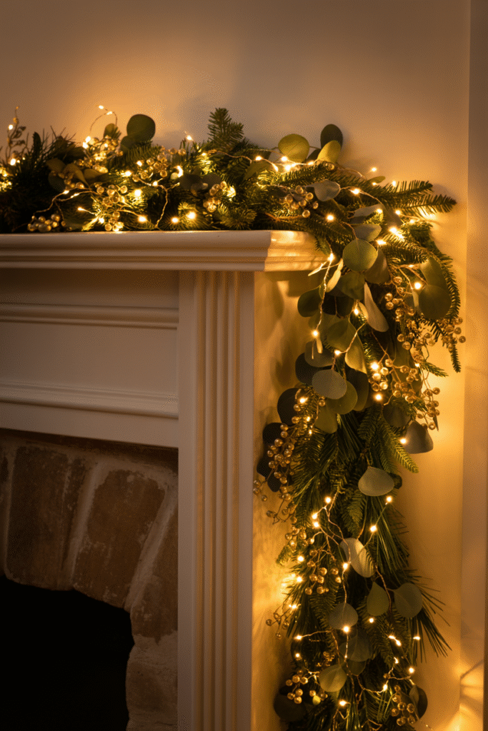 A lit garland instantly transforms your mantel into a winter wonderland. Try pre-lit eucalyptus garlands or pine with gold berries for texture and sparkle. Tip: weave in fairy lights on a timer for effortless magic every evening.