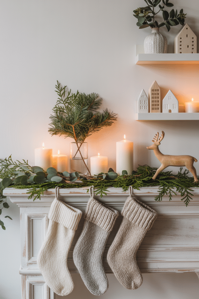 For a Scandinavian twist, simplify. Stick to white candles, fresh greenery, and neutral stockings. Add a few ceramic houses or wooden reindeer for a cozy-yet-minimalist Christmas aesthetic.