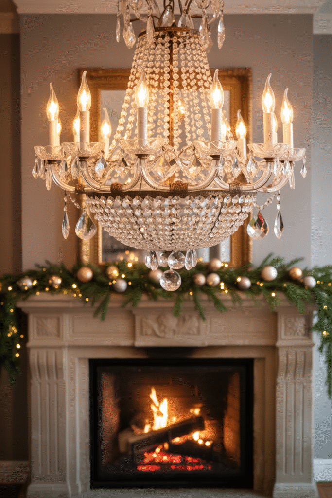 Want drama? Hang a mini crystal chandelier or elegant pendant light above the fireplace. It instantly adds luxury Christmas decor vibes. Even a small light fixture or battery-powered pendant can elevate your whole setup.