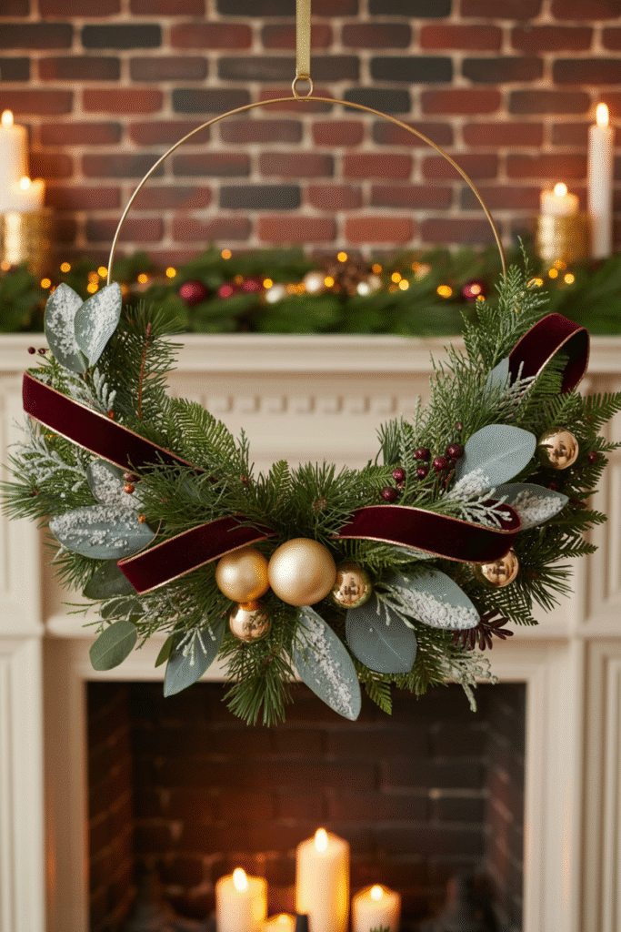 A wreath above the fireplace anchors your decor. Go traditional pine, snow-frosted eucalyptus, or ornament-filled. For a high-end touch, use velvet ribbon or hang it from a gold hoop.