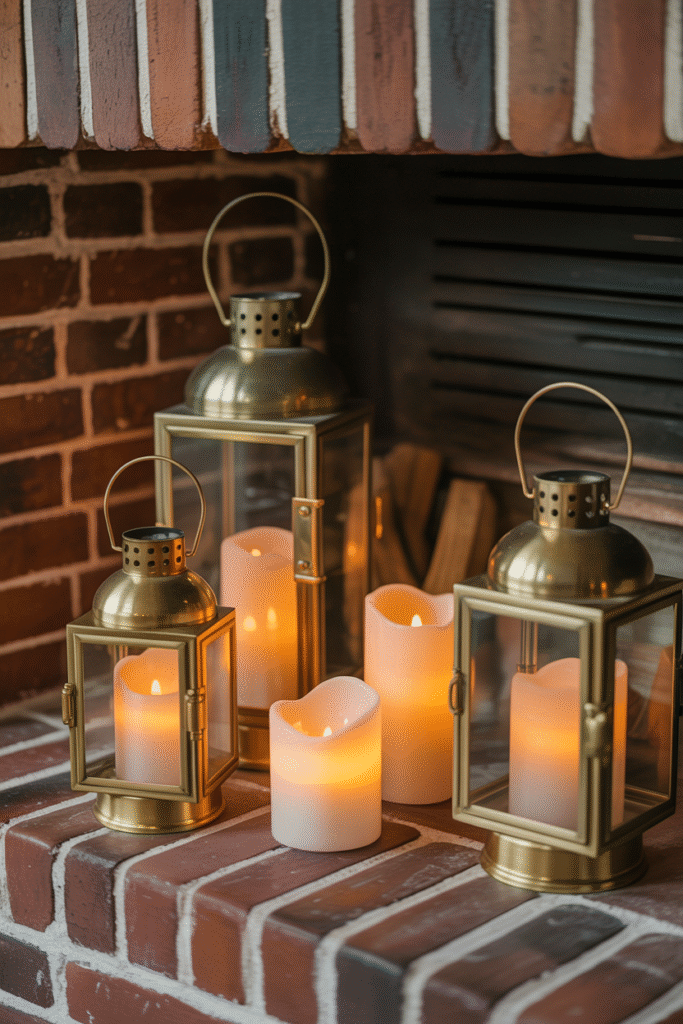 Cluster candles in varying heights across your mantel or hearth. Mix brass lanterns, frosted glass, and LED pillar candles (for safety). The glow will make your entire room feel peaceful and photo-ready.