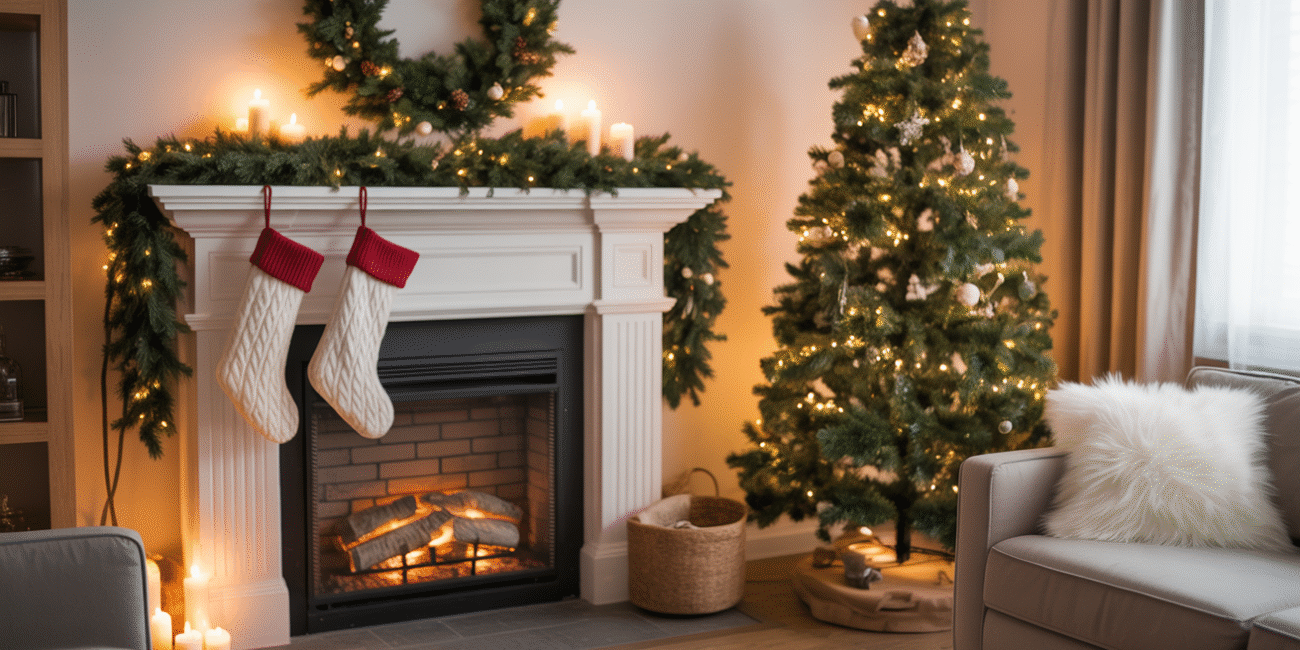 There’s something timeless about gathering around a crackling fire. The fireplace naturally becomes your holiday focal point — a cozy anchor for stockings, garlands, and glowing lights. Even if you don’t have a working fireplace, a mantel display (or faux hearth) can bring that same comforting energy into your space.