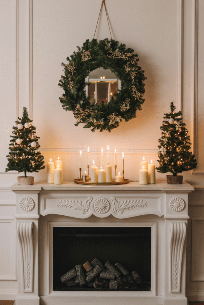 If you crave a designer finish, think symmetry. Place matching candleholders, stockings, and mini trees on each side of your mantel. A centered mirror or wreath ties it all together — like a magazine cover brought to life.